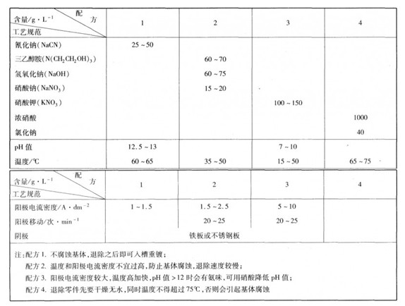 在鍍銅錫合金過程出現(xiàn)的不合格鍍層,退除方法見表4-1-7。