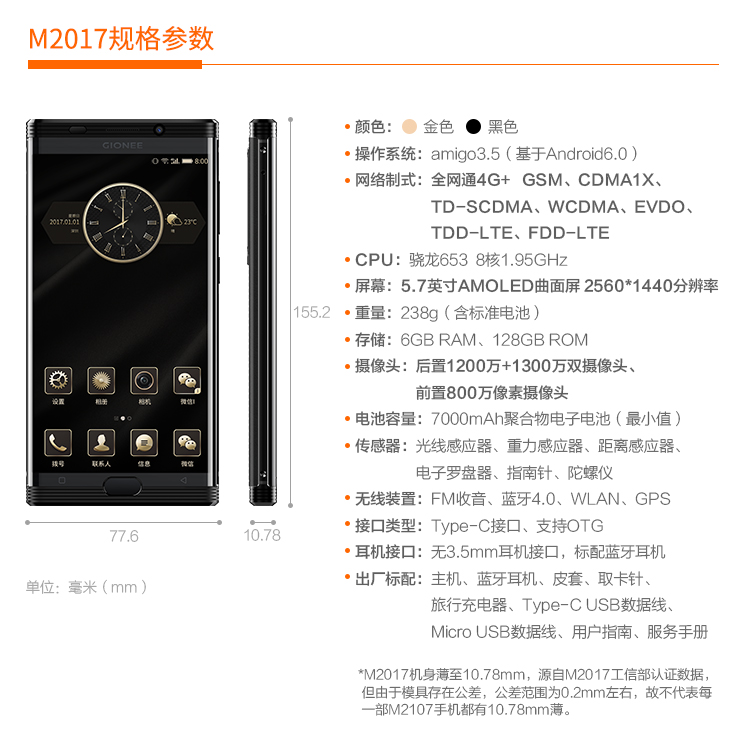 作為金立首款進(jìn)軍高端市場(chǎng)的旗艦產(chǎn)品,金立M2017的定價(jià)自然也很高端。金立M2017 6GB+128GB版本售價(jià):6999元。此外,金立還推出了限量版的6GB+128GB鱷魚皮私人定制版,售價(jià)16999元。